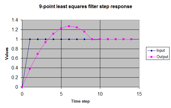 The step response for a least squares filter shows “overshoot” in response to a sudden input change: the filter output can change more than the input for a period of time. This can lead to quicker detection of problems, but it also can lead to temporary false alarms. For this reason, caution should be exercised in using these filters. The above comments on overshoot only apply to filtering to estimate the current value. This will not be a problem when “smoothing” to estimate the value at the midpoint of the time window.